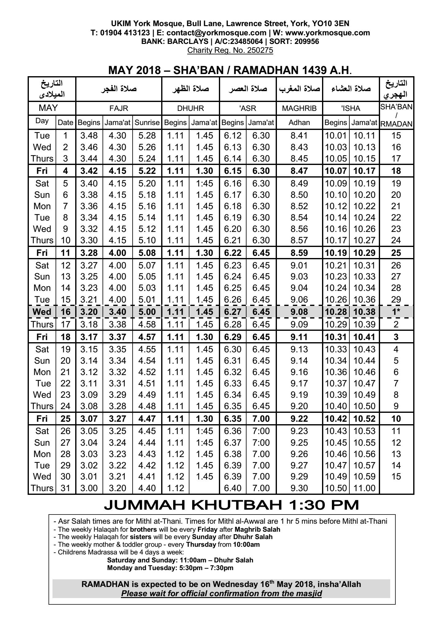 York Mosque Timetable